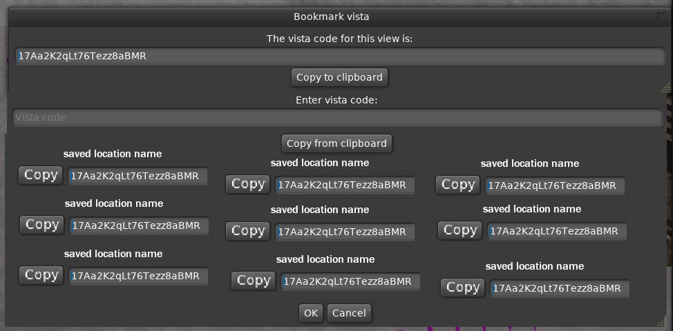 Vistas are located within the "cities" contextual menu. They are teleport codes which users can generate to save locations and share with others.